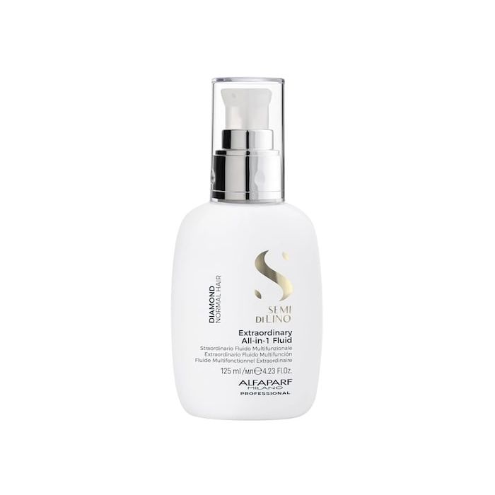 Alfaparf Milano Semi Di Lino Diamond Extraordinary All-in-1 Fluid is a leave-in fluid that gives extreme, instant shine, detangles hair, helps protect against UV rays, protects the cosmetic color, prevents split ends, controls frizz, counteracts the effect of humidity, seals the cuticles, makes hair soft and silky and easier to brush.