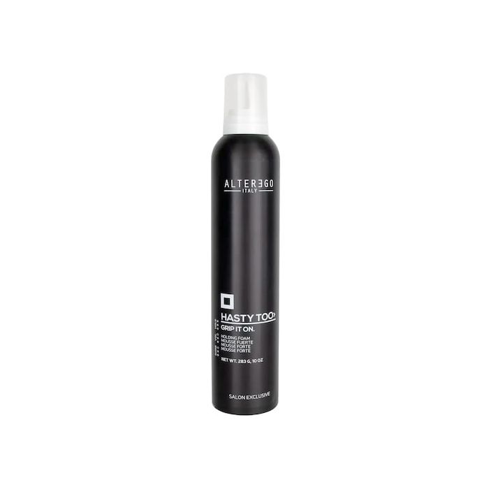 The Alter Ego Hasty Too Grip It On Holding Foam is a strong hold mousse for a full-bodied effect and lasting manageability. It features a light and airy texture that is easy to apply and leaves behind zero residue.