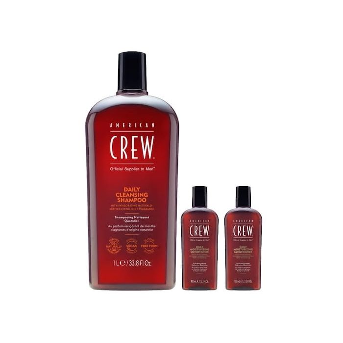 Enriched with Vitamin B5 for moisture, our silicone-free American Crew Daily Cleansing Shampoo is ideal for an everyday haircare routine. Plus 2 Free 3 in 1 Tea Tree Shampoo, Conditioner & Body Wash 3.3 oz each.