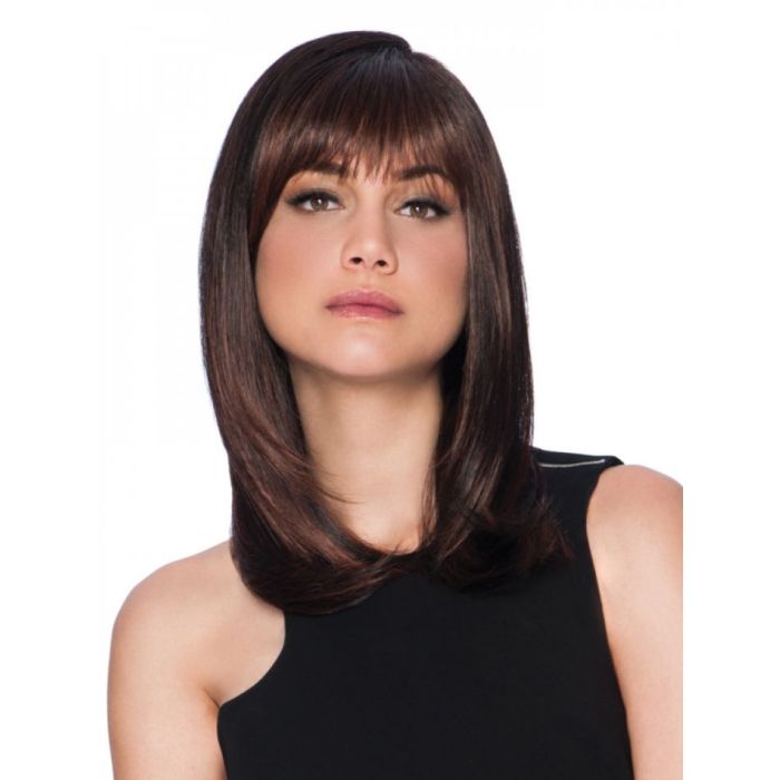 Bangs gently wisp about to define the face. The silky soft strands replicate the lush, natural looking texture of human hair with the added versatility of using any thermal styling tool you desire.