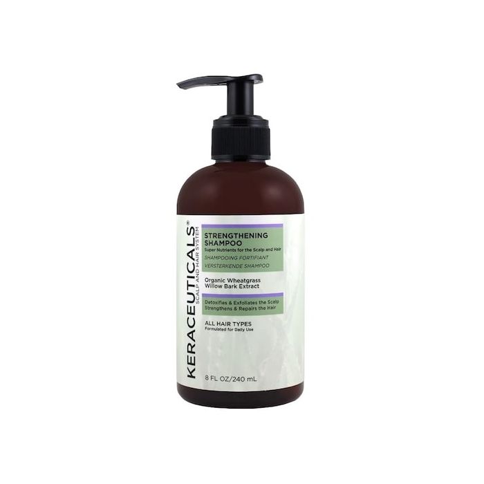 Keraceuticals Strengthening Shampoo fortifies the hair and “feeds” the scalp with Super Nutrients.
