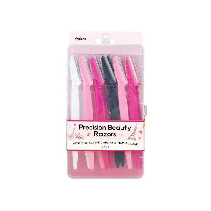 These Precision Beauty Razors are the perfect tool for removing unwanted hair in precision necessary areas. Easily and effectively trim eyebrows and remove peach fuzz. For a flawless makeup application and better absorption of skincare products. Removes fine hair to reveal smooth, soft, radiant skin. Comes with 12 razors in assorted colors and travel case.