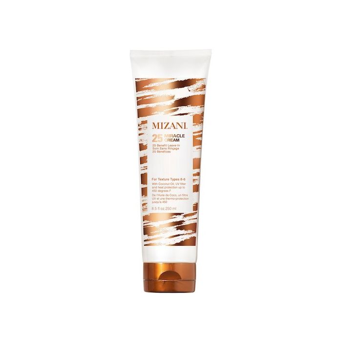 Mizani 25 Miracle Cream is a multi-benefit leave-in cream with UV protection for color-treated hair that defines curls and coils and addresses dryness.