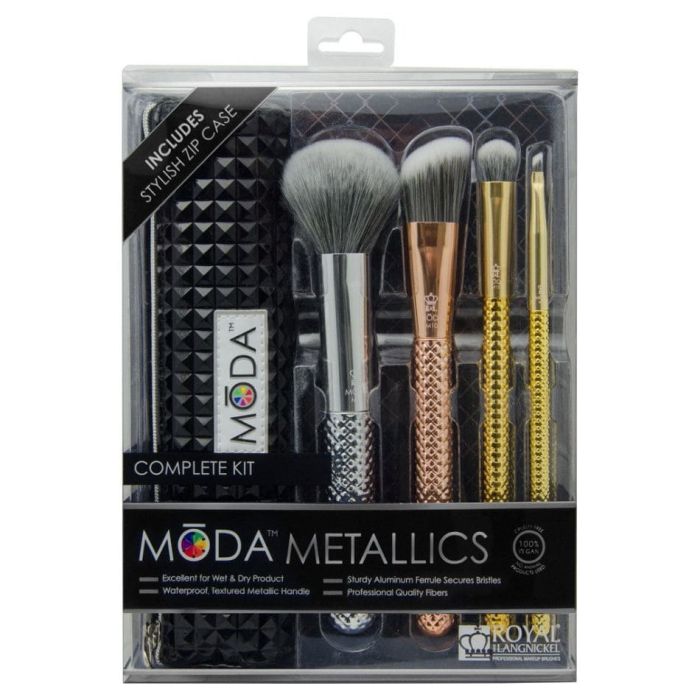 This 5 piece MODA Kit includes professional quality brushes that are comfortable to use and feature metallic coordinating colors that make a statement. The pouch is perfect for travel and easily wipes clean.