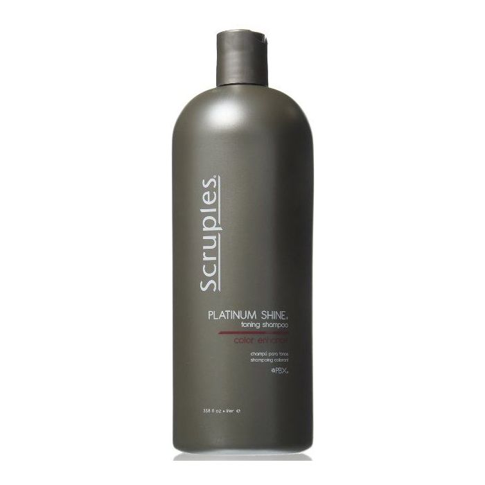 The Scruples Platinum Shine Toning Shampoo tones and removes brassiness from blonde and gray hair. This gentle shampoo instantly helps to neutralize warm and brassy tones in blonde, grey, and light brown hair with its deep blue, violet pigmented base.