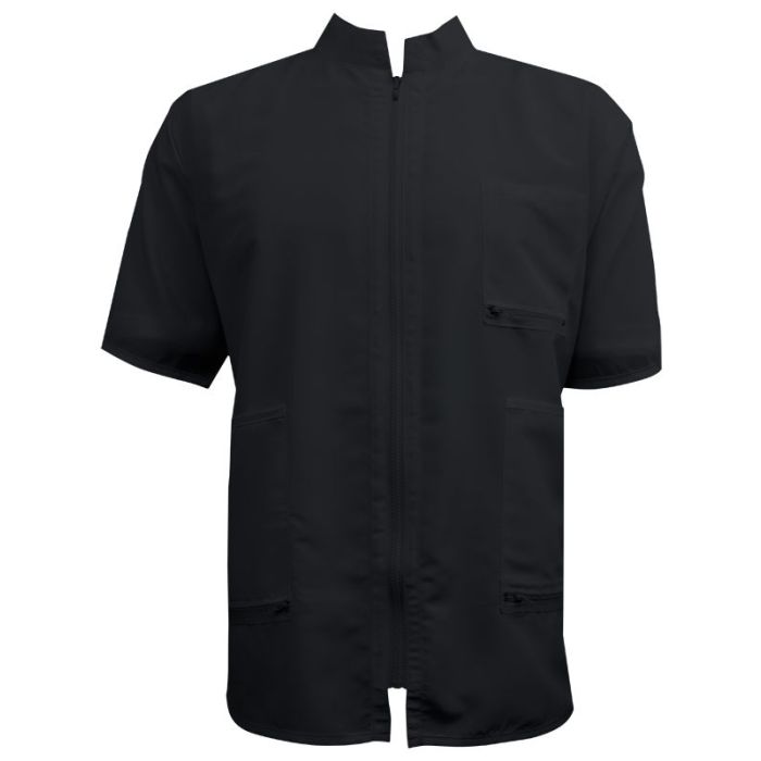 Unique collar. Strong front zipper. Three front pockets with zippers for debris removal. Water repellent. High nilon quality. Matching cutting cape available.
