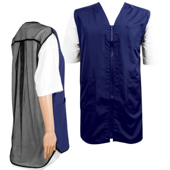 Sleeveless vest for mobility and comfort. Complete mesh netting on the back for ventilation. Strong front zipper. Three front pockets. High nilon quality. Matching cutting cape available.