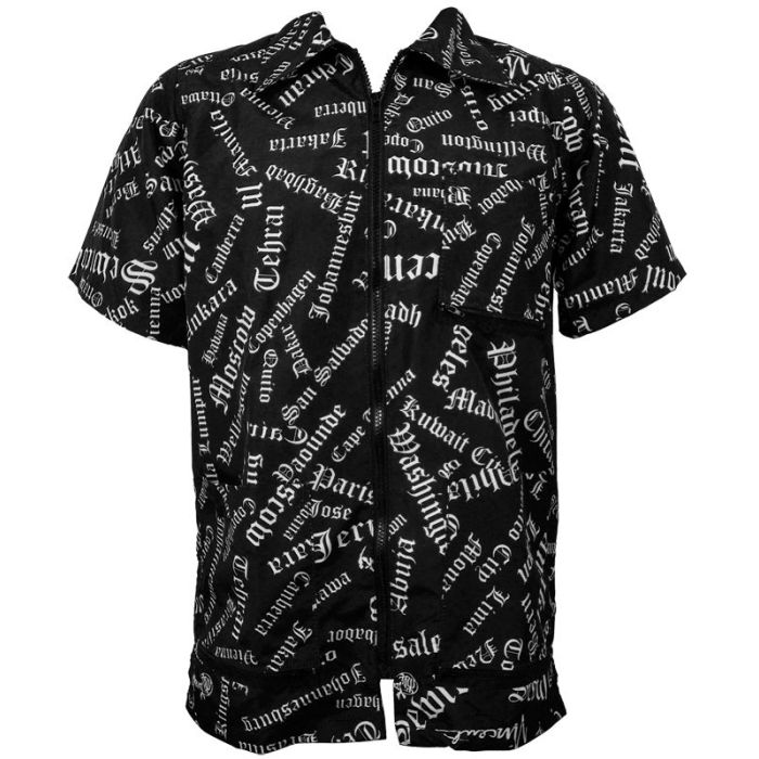 Major international city names in a gothic pattern. Strong front zipper. Three front pockets with zippers for debris removal. Water repellent. High nilon quality. Matching cutting cape available.