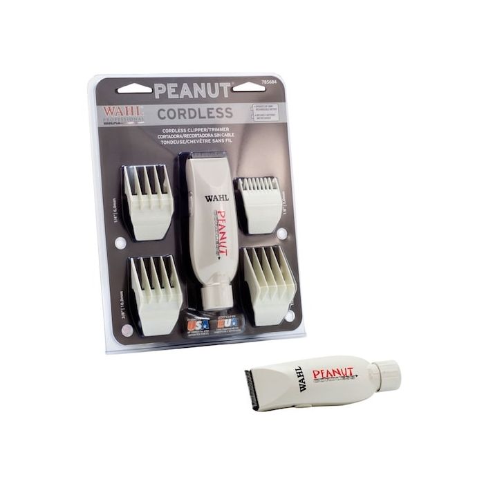 The Wahl Cordless Peanut is an excellent alternative to big and heavy clippers. It is a cordless version of the best selling clipper/trimmer. It has been used extensively for years in salons and barber shops for light clipper duty and for trimming and neck lines. It includes a recharging stand, attachment combs, a cleaning brush, oil, two batteries and instructions.